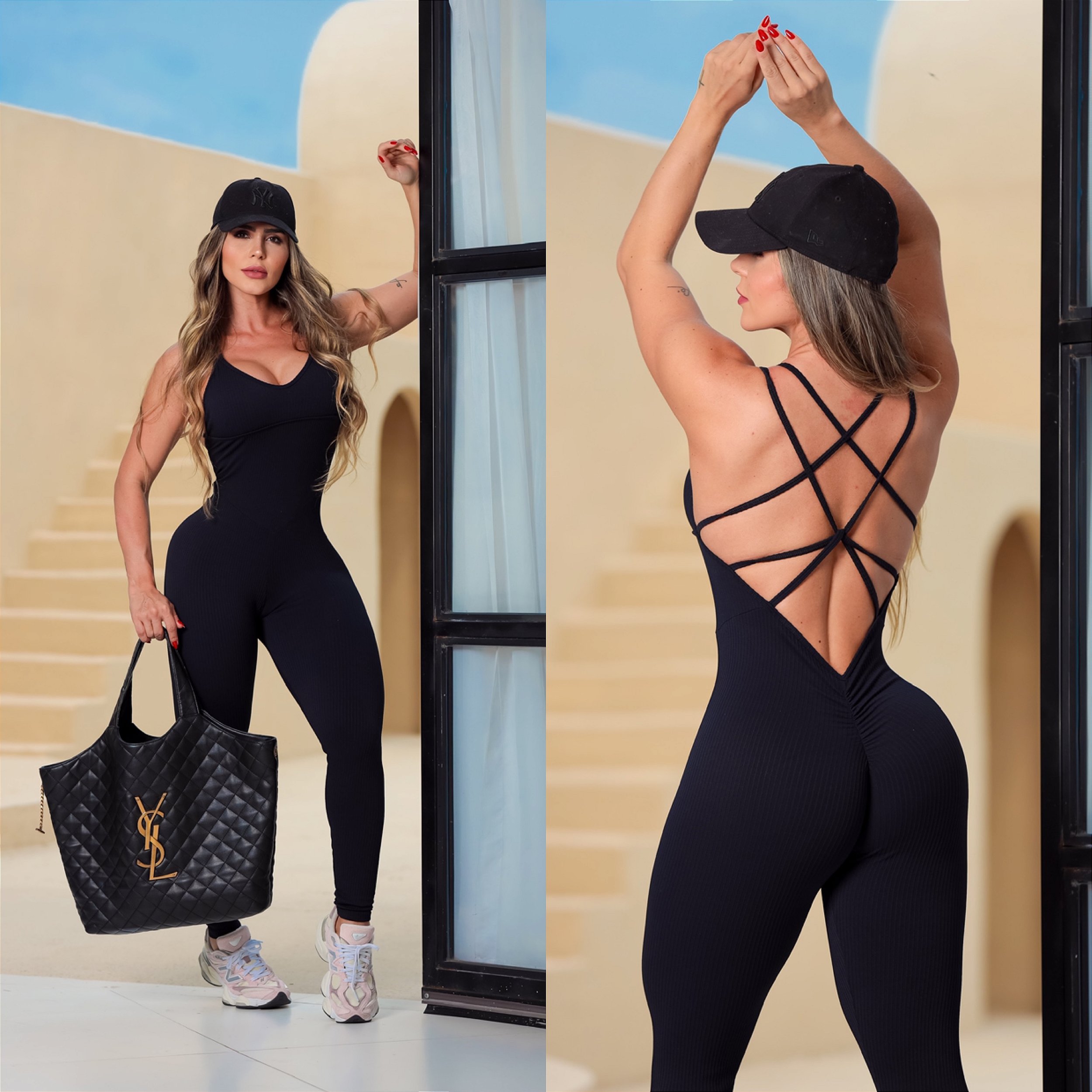 Macacão tecido canelado poliamida , push up , possui bojo removível
